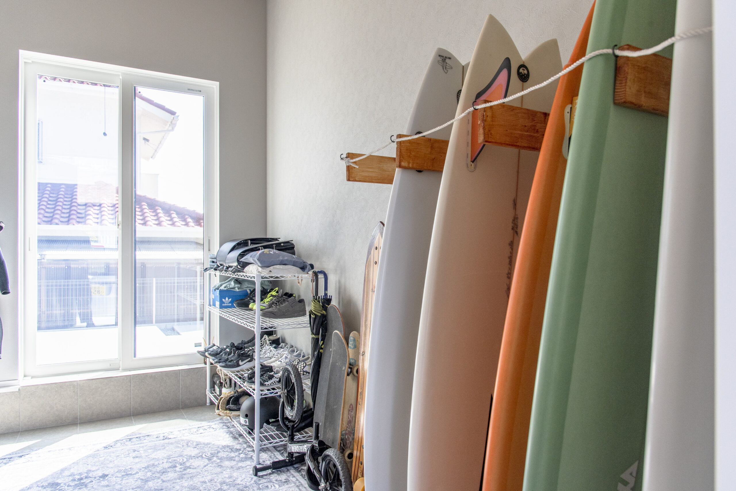 サーフィンが趣味のご家族に合わせて、使い勝手のいい土間スペースを