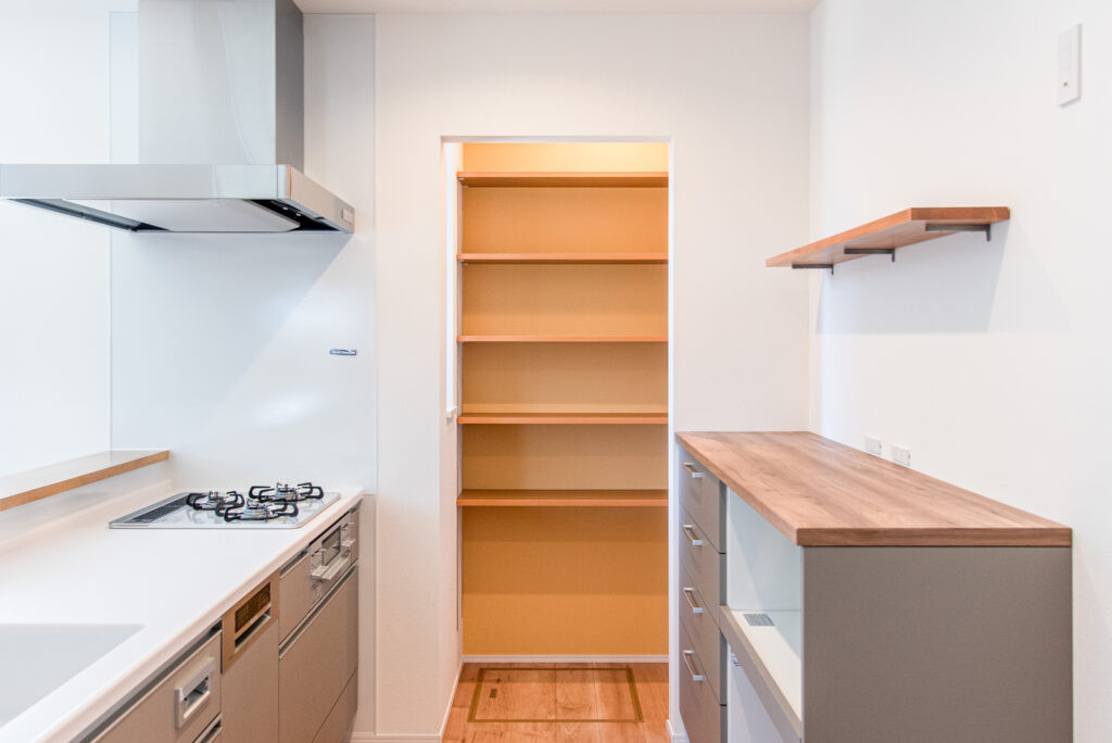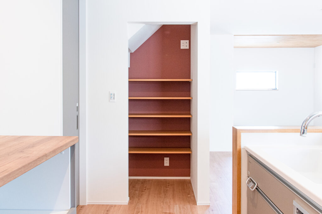 収納スペースも壁をアクセントクロスにし、扉をつけないことで空間の繋がりが生まれ