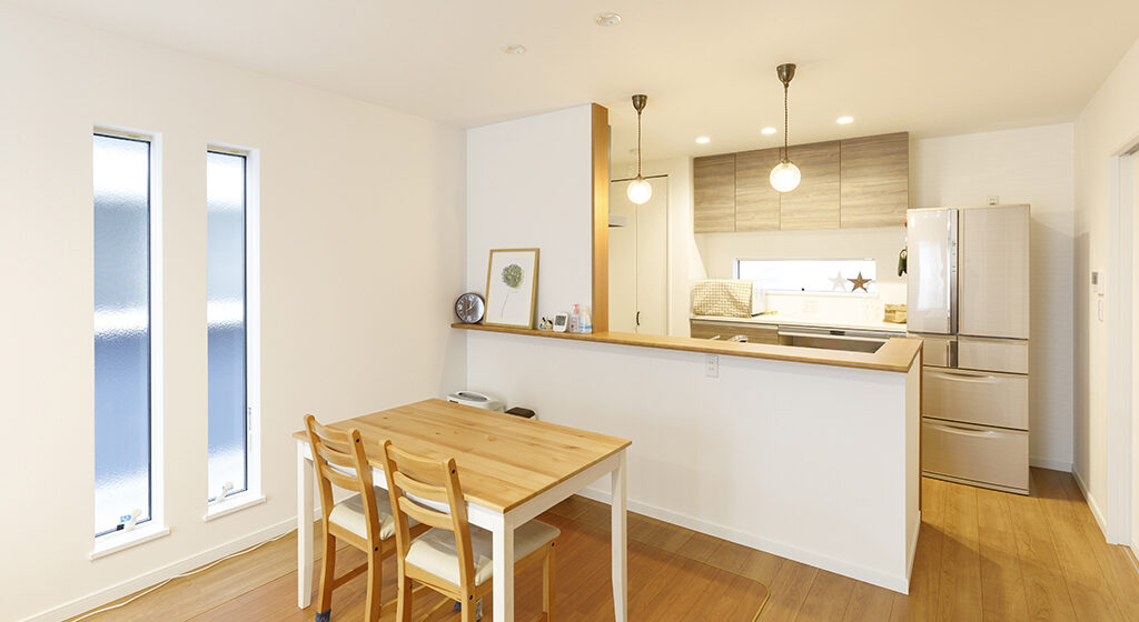 木目のカウンターと床材があたたかみを感じさせるキッチン空間。やわらかな光を灯すペンダントライトがアクセントとなり、食事の時間をより心地よく演出します。