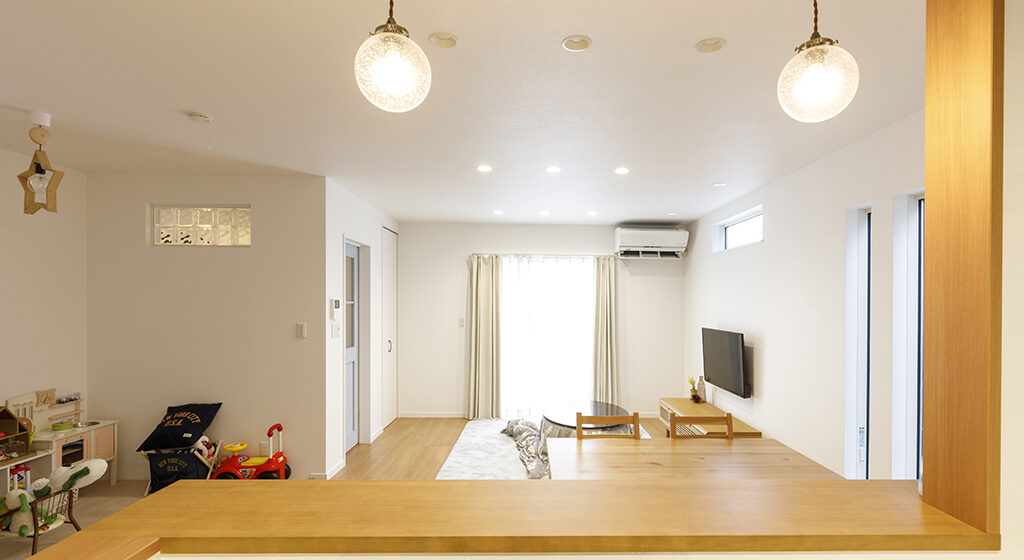リビング・キッチン・キッズスペースまで見渡せ、家族の気配を感じながら暮らせるS様邸