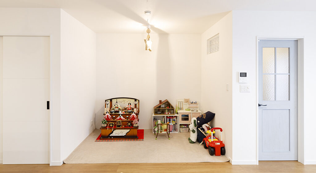 リビングの一角に設けたキッズスペースは、お子さまが安心して遊べる空間。やわらかな色合いの内装と、遊び心のある照明が空間を優しく彩ます。